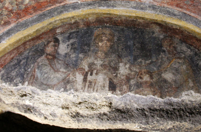 იესო ქრისტეს უძველესი გამოსახულება მოწაფეებთან ერთად catacombs of St. Tecla near St. Paul’s Basilica in Rome.